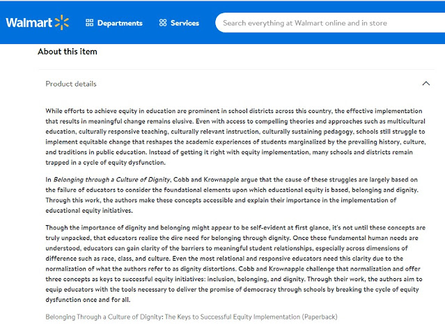 In this portion of her response, Dr. Grunewald claims she’s read the book “Belonging Through a Culture of Dignity”. Here’s what WalMart said about the book when I went searching for it.