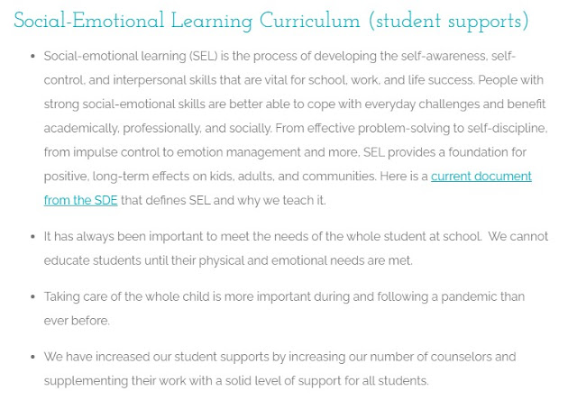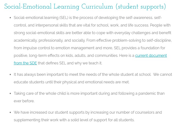 Bullet point 4 – SEL=CRT. Guest poster Emily Wright (EPS mom of 3) made that abundantly clear in her blog of this week. You can find that here. SEL is Social Emotional Learning, another education fad created by a bunch of leftist teachers in order to indoctrinate children. If you don’t believe me, read this page. Talk about mumbo-jumbo, word salad – not to mention that children’s EMOTIONS are strictly the territory of PARENTS, not schools.