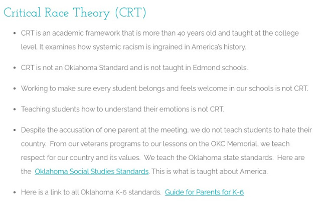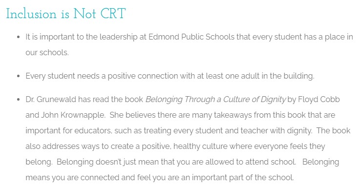 During the meeting, Molly shared her CRT concerns with Dr. Grunewald who assured her they were not teaching CRT tenets in Edmond Public Schools. So, with little further to say after that ‘assurance’, Molly headed home to read the book she was given.