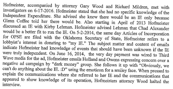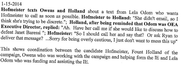 Without going into great detail, between April 2013 and November 2014, Hofmeister, Stephanie Milligan (now Alexander), Steven Crawford (former CCOSA President), Lela Odom (then with the OEA), and Fount Holland (political campaign strategist now of CAMP) apparently coordinated together on Independent Expenditures through a dark money group run by Alexander called “Oklahomans For Public School Excellence” to get Joy Hofmeister elected Oklahoma State Superintendent of Public Instruction.