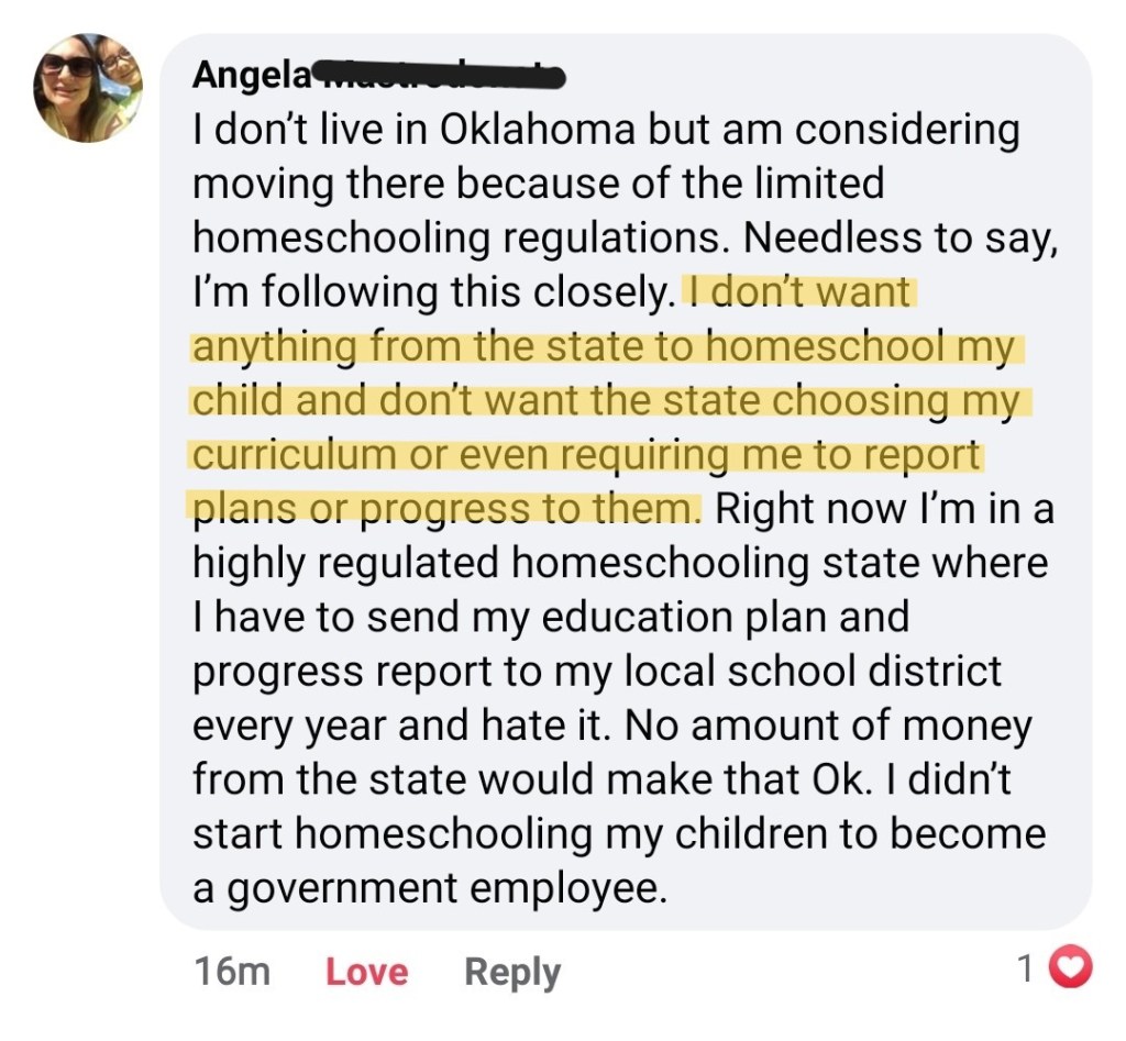 Last year, during our fight to prevent Republicans from making homeschool and private schools public via SB1647, a lady reached out to us on our Facebook page and said,