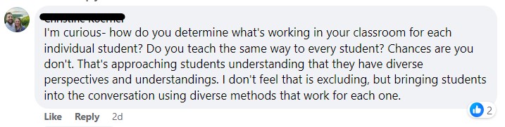 This comment made me feel the need to respond because of the use of her language, “bringing students into the conversation”, “using diverse methods”, “approaching students” – all which are progressive education buzzphrases – so I responded: