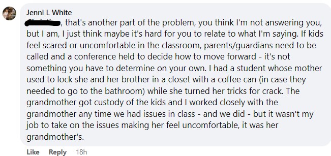 The particular theory this young teacher espouses asserts that teachers should become the parents of the children – because, obviously, the parents are not doing their jobs if kids are coming to school scared and weak and timid. Sadly, it’s true for many children today. Many parents use school as a babysitter and could care less what their kids are doing in a day to actually recieve an education, but that doesn’t mean it’s THE JOB OF THE TEACHER TO RECTIFY THE POOR UPBRINGING OF THEIR STUDENTS. In fact, most of the time, it’s either a psychologist, or the school of hard knocks that changes students with downward trajectories – if they do – some, sadly, go to prison or wind up dead. Still and all, the lifetrack of a child is not the responsibility of the teacher. The education of that student is – alone – the job of the teacher.