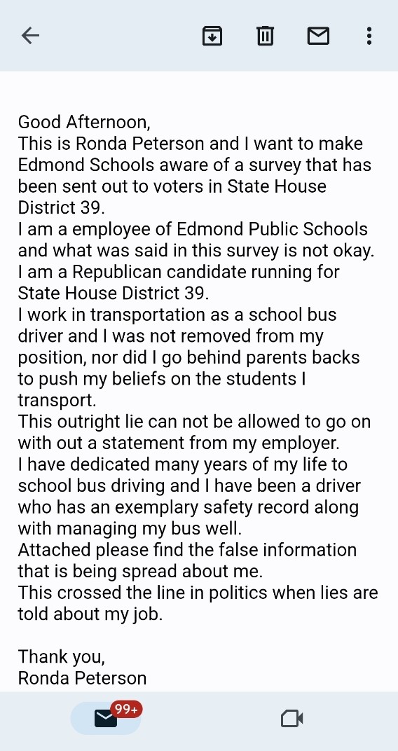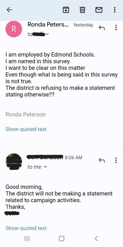 Ronda asked Edmond Public Schools Administration to make a public statement – not on her behalf as a candidate – but about her employment status. Though Peterson has been employed with Edmond Public Schools for 22 years, she was refused on grounds that EPS policy prevents them from commenting on an employee’s employment status.
