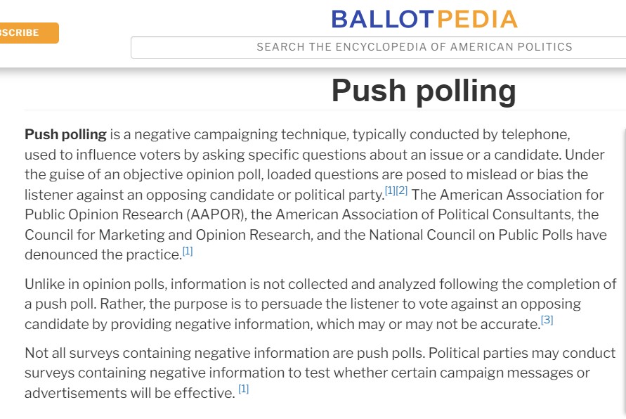 NOTE: This text says “Ronda Peterson WAS removed…” from her position, but it does NOT SAY from what school system she was fired. This kind of a poll hopes to trap uneducated voters into NOT paying attention to the fact that the name of the school from which Ronda was presumably fired IS NOT LISTED, hoping that readers will tend to believe it’s the school where she is currently employed. As the Ballotpedia definition for push polling points out, this is VERY, VERY bad stuff.