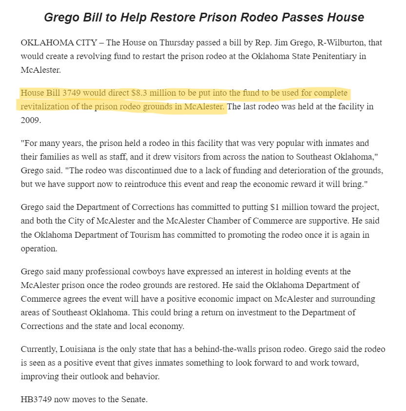 - Who complains about our horrible roads and the lack of pay for fire and police? Lots of Oklahomans. These are legitimate functions of government, yet, when we give millions of dollars away for a prison rodeo, these are the things that get short shrifted. And if they don’t, THEN THE GOVERNMENT IS TAKING TOO MANY OF OUR DOLLARS IN TAXES IN THE FIRST PLACE!