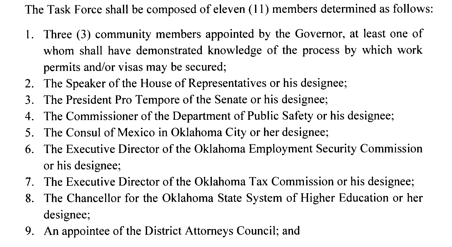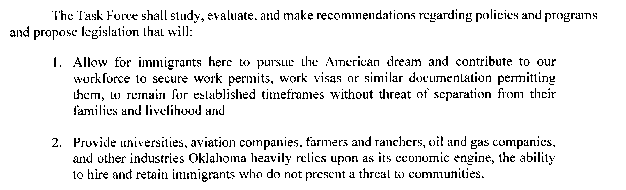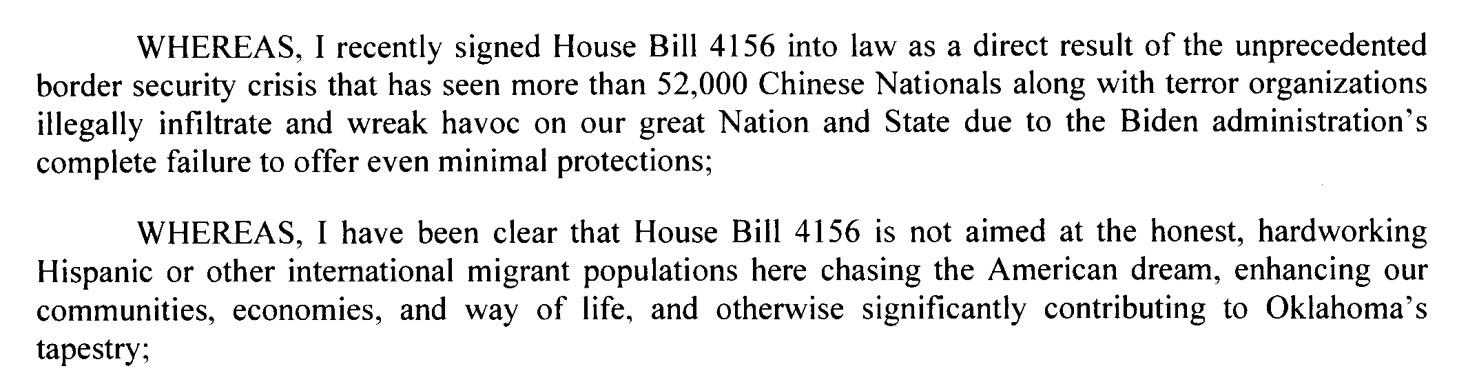 In fact, it’s almost as though the EO says, ‘We have a bunch of Chinese Nationals who are causing crime in Oklahoma, so we’re going to get these people out of the state, but everyone else here illegally is honestly working to fill jobs too good for legal Oklahomans and we need them to stay, so we’re going to figure out a way to make that happen’.