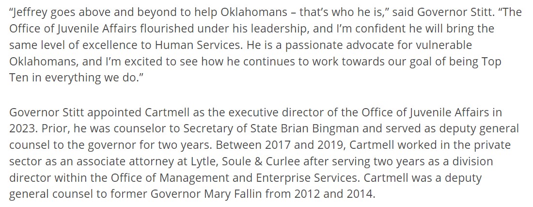After the resignation of Oklahoma DHS director Deborah Shropshire, Governor Stitt moves one of his appointments from the Director of the Office of Juvenile Affairs, to that position. Jeffery Cartmell was Stitt’s appointment to OJA. The following is an excerpt from Stitt’s announcement of Cartmell’s appointment to DHS.