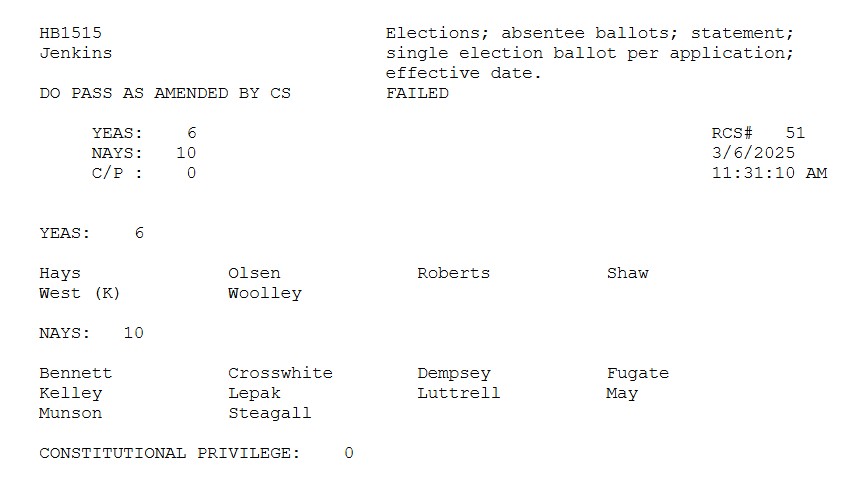 Rep. Steagall and I have been arguing back and forth most of the day over the bill – though it’s too late for this session. My argument is that we KNOW – certainly in Edmond – that absentee ballots have changed election results. Having absentee ballots sent out in the mail indiscriminately (which has happened) allows nefarious people to use the ballots toward their end. In addition, having as many absentee ballots as are used now, over the days that they are allowed to turn them in, poses real issues for chain of custody. It used to be that, unless you had an excuse as to why you couldn’t turn up at the poll, you had to turn up at the poll.